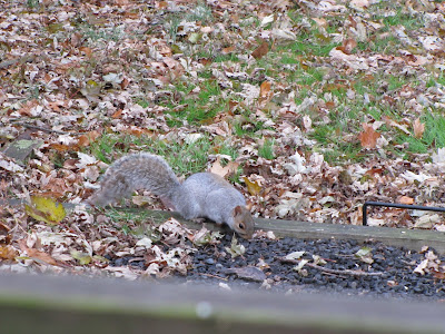 9.23 a.m. Squirrels are SO CUTE. It isn't eating any of the bird seed that is being scattered all over the ground. It's sitting there slowly cleaning itself with its paws, just like a cat.